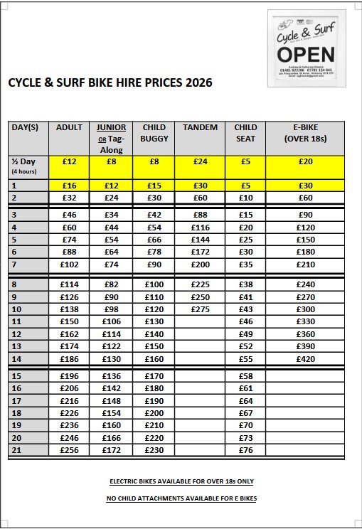 £16 per day for adult bike £12 per day for a junior bike £30 per day for our new electric bikes Discounts available on longer hires for pedal bikes PLEASE NOTE: e-bikes are only for rental to those aged 18+, and no child attachments (child seats, tag-a-longs, buggies) can be used with e-bikes